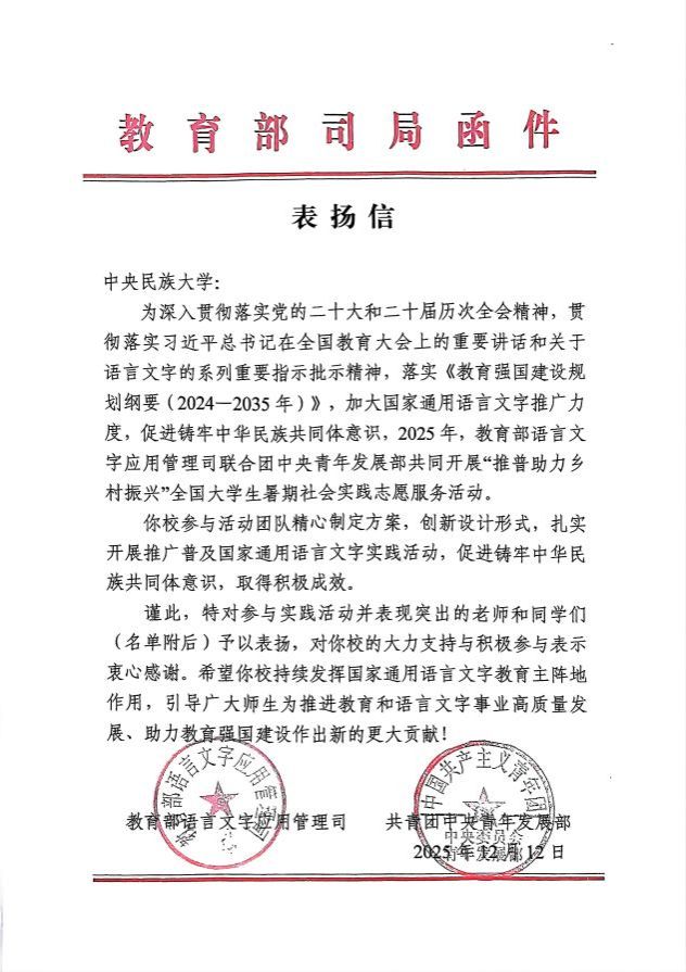 这份荣誉既是学院铸牢中华民族共同体意识教育实践、积极推广国家通用语言文字与科学保护民族语言文化融合推进的生动成果,也是对该团队扎根基层、以专业赋能民族地区发展的高度认可!
