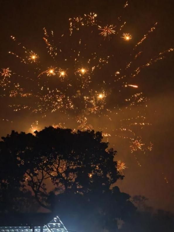 树影摇曳为衬,黑夜沉静作底。烟火绽放处,人间尽欢颜。金光散时,万事皆长安。