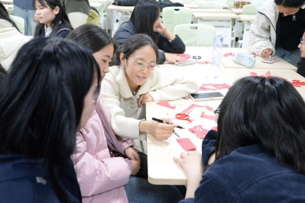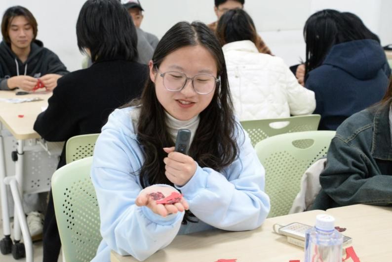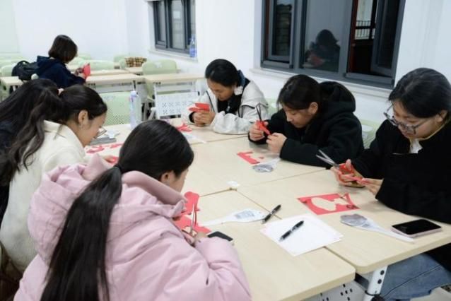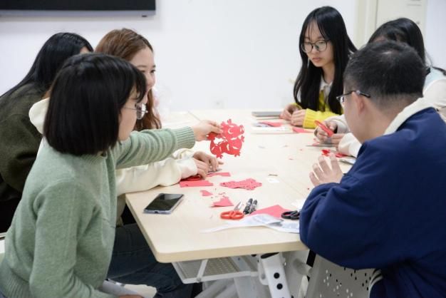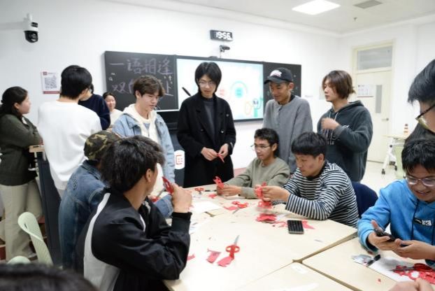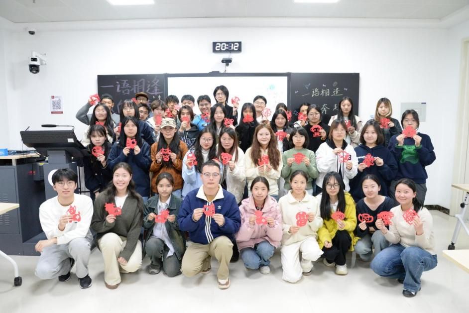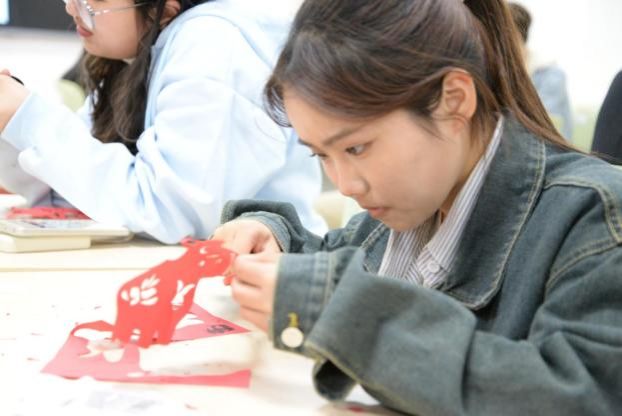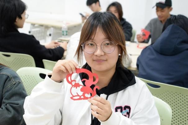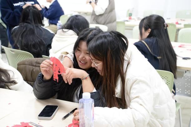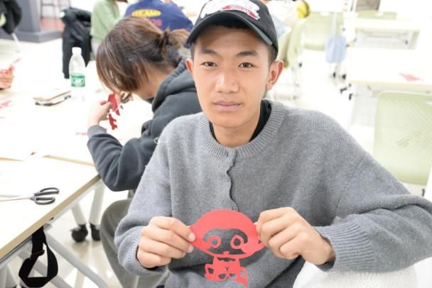 凝神聚心间,指尖巧翻飞。同学们领取剪刀彩纸,对照参考图案开启创作,伴随着清脆的剪纸声,一个个活灵活现的生肖形象跃然纸上。每一幅作品都藏着独有的心意,也成了连接彼此的温馨纽带。沉浸式的手工创作里,同学们舒缓身心、拉近距离,陌生的隔阂悄然消散,也为后续的语言交流搭起了天然的桥梁。