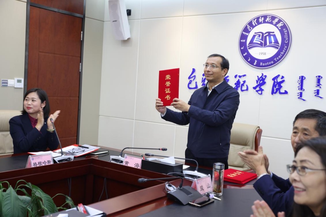 随后,包头师范学院黄海书记、双山副校长、格根哈斯副校长和文学院李国德院长为“中国少数民族双语教学研究会时代楷模”称号获得者颁发证书,以铭记丁文楼、刘厚生、杨光远、余惠邦、张廷芳、陈世明、胡振华、哈斯额尔敦、盖兴之、瞿霭堂(以姓氏笔画排序)老一辈专家学者为双语教学工作做出的巨大贡献。